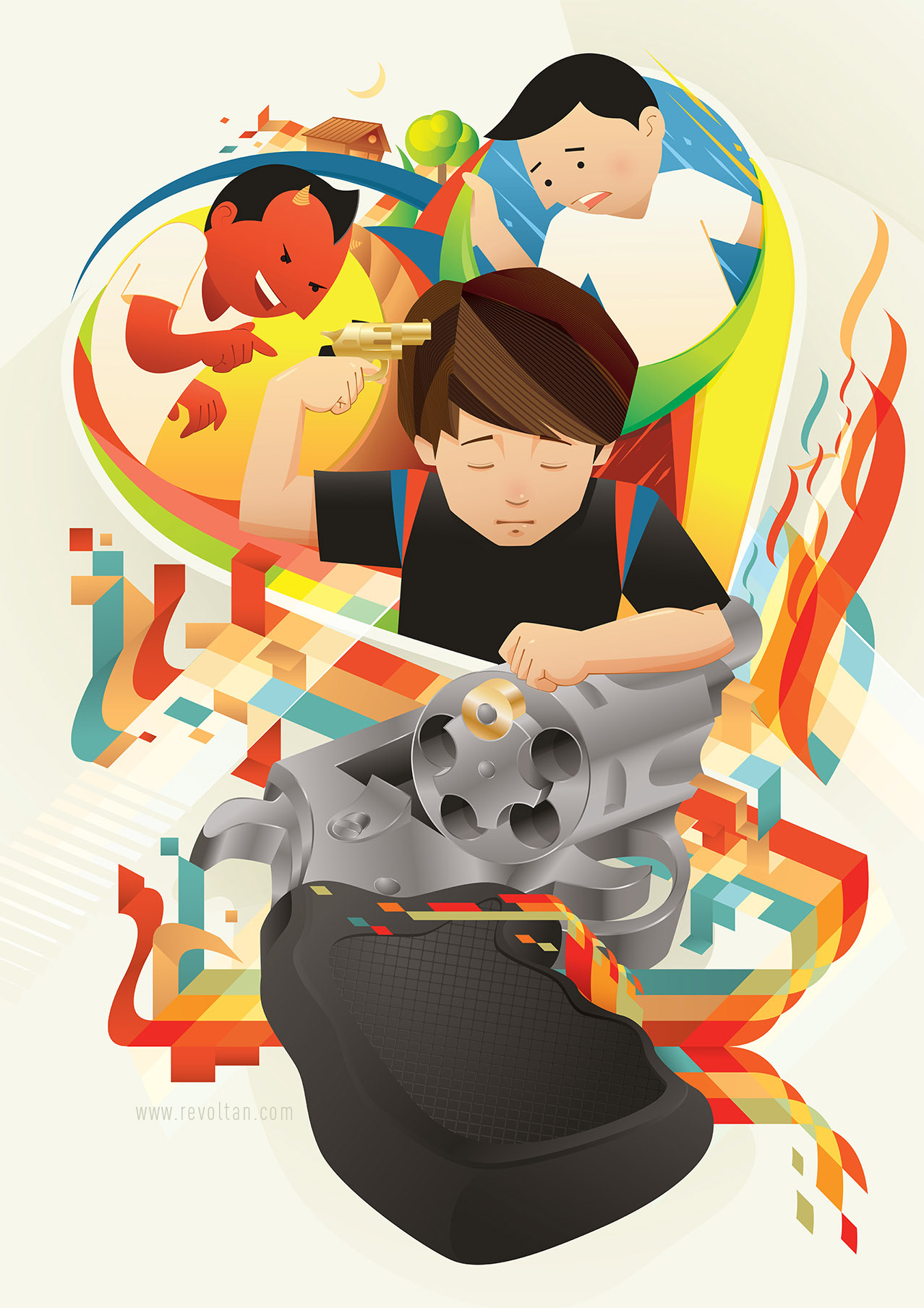 An illustration that describes a troubled feeling when considering the mistakes of the past that make us hate ourselves. Full vector, done entirely with Adobe Illustrator.